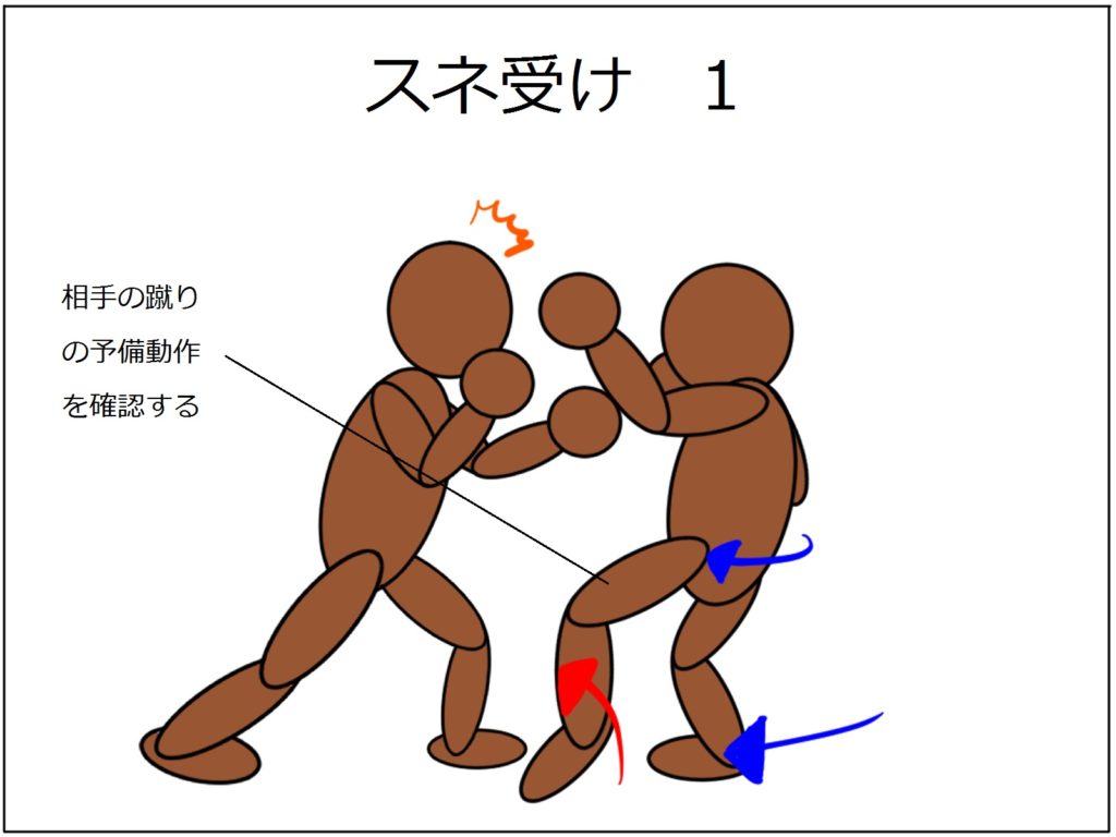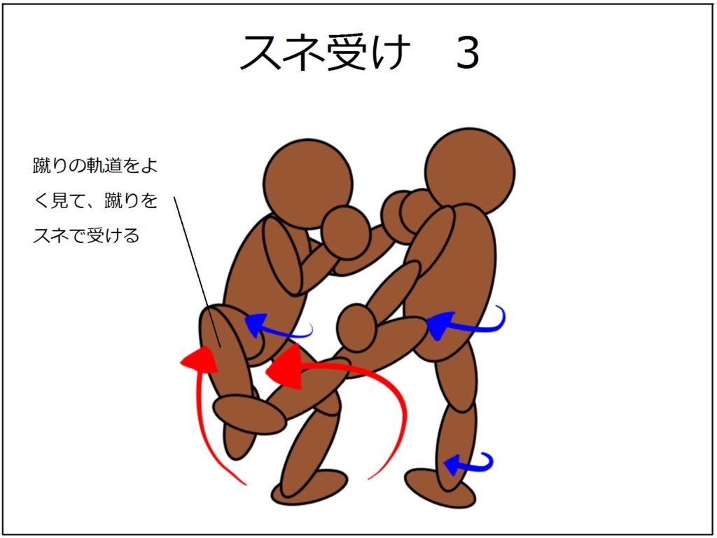名前は「スネ受け」ですけどスネで迎え撃つというワケではなく、ヒザから下を「プラーン」と脱力して、ヒザの稼動方向に合わせてうまく蹴りの力を受け流すカンジです。