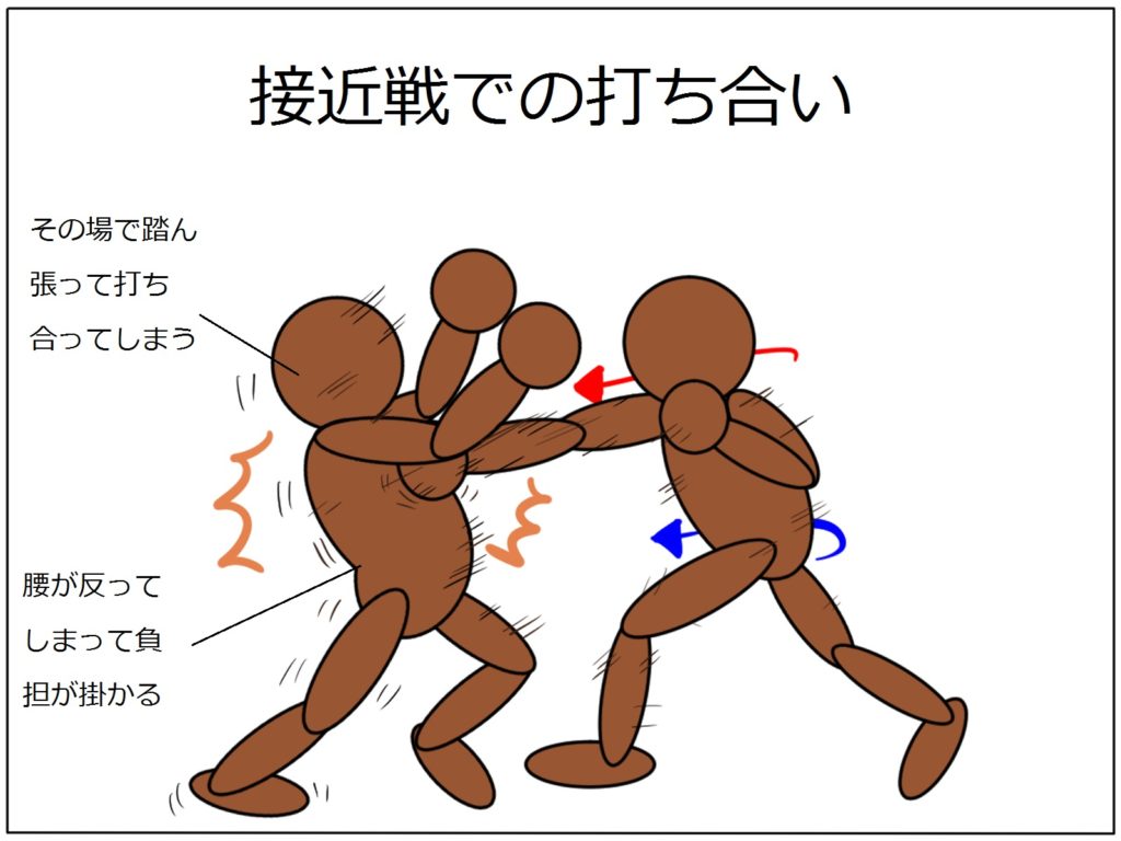 相手に突きに対して喰らいながらその場で踏ん張って打ち合うと、この様に仰け反ってしまう事があります。