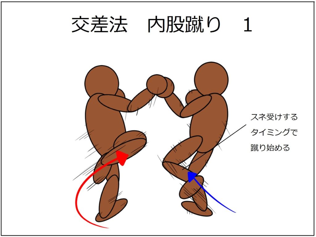 1. 内股蹴りを出すタイミングは、スネ受けするタイミングと一緒