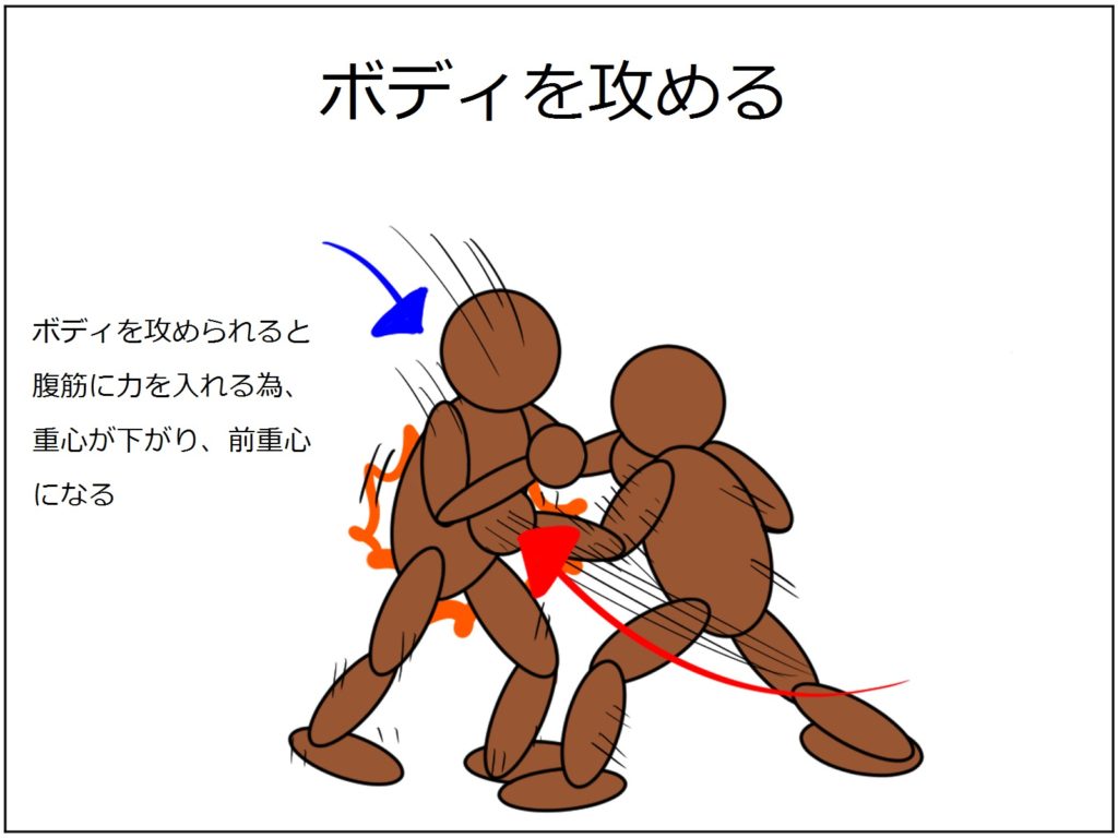 ボディを攻めれば反っている体勢を前のめりの体勢にさせる事が出来るので、前のめりにさせれば上段への蹴りが出しづらくなります。
