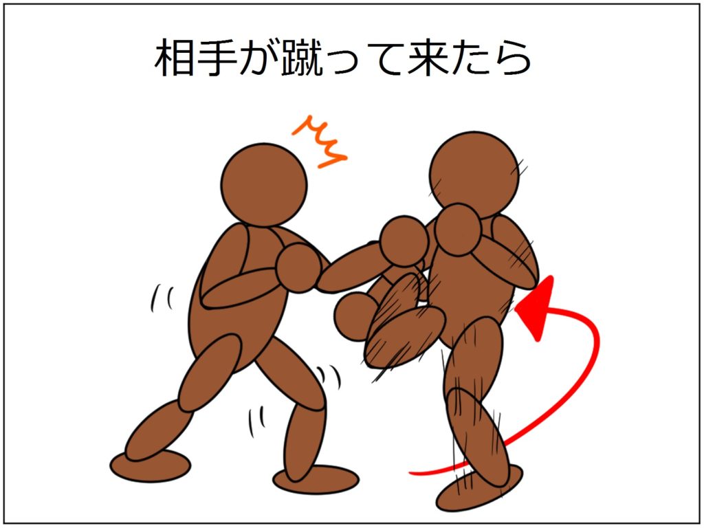 蹴りを喰らってしまう状況になった時の有効な対処法の一例を紹介しました。