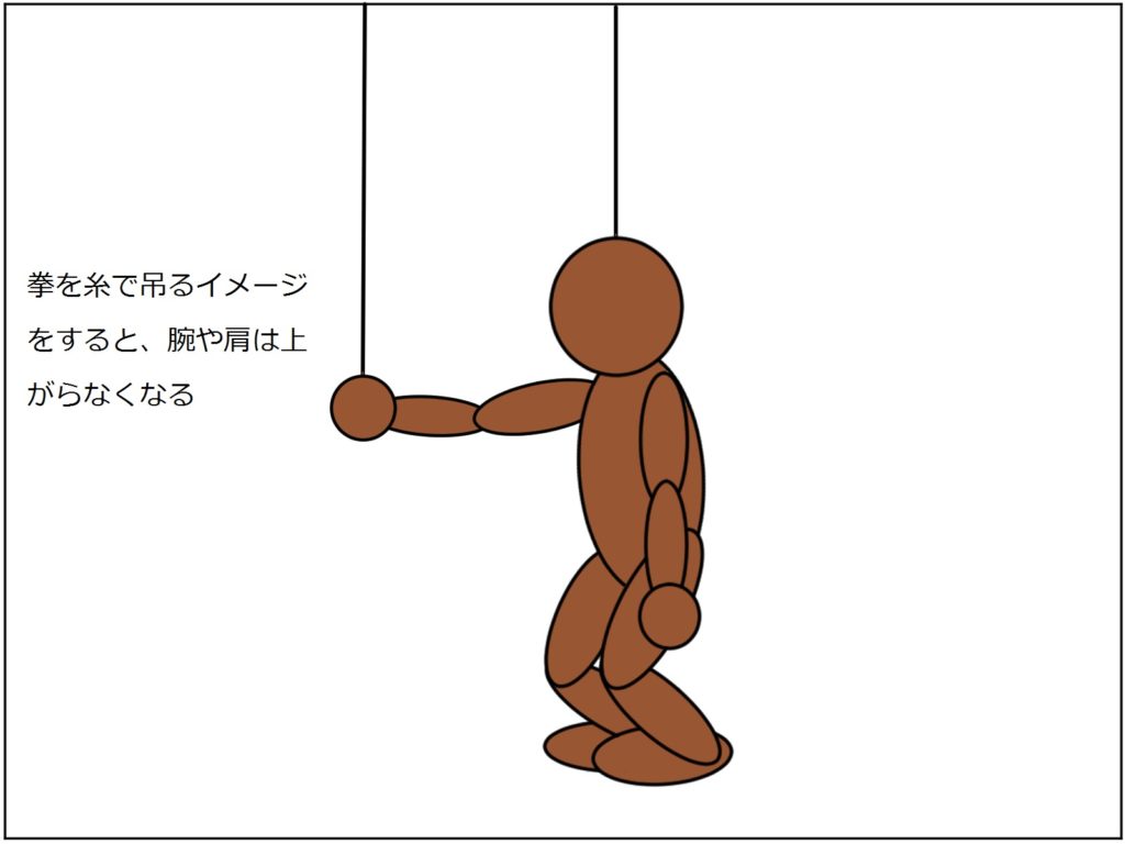 これも同じで、拳を糸で吊っている様なイメージをすると、イメージの中では肩は上がらずに拳だけ吊られて上げられている状態が出来ると思います。