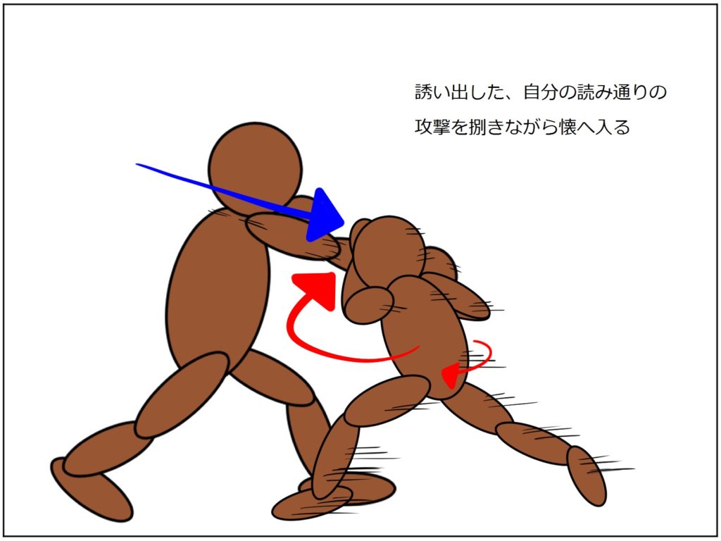 相手の攻撃が当たるか当たらないかのギリギリの位置で踏み込む様な、攻撃を仕掛ける様な素振りを見せつつ相手の攻撃を誘い出します。